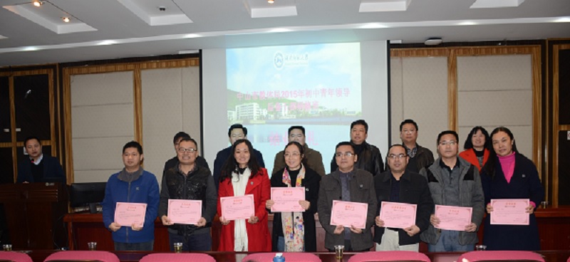 12月30日下午,中山市教体局2015年初中青年领导后备干部研修班结业典礼在216报告厅举行。中山市教研室副主任段菁华、信息技术教研员陈明宏,公司继续教育公司副经理吴跃飞、文公司党委书记李伶俐、suncitygroup太阳成集团副经理彭万福、继续教育公司培训科科长张雪梅等出席结业典礼。结业典礼由suncitygroup太阳成集团成教办主任张德强主持。