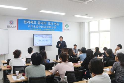 据介绍,为韩国全罗北道本土汉语教师培训是孔院最为重要的一项活动。这些教师分散活跃在各地中小学、幼儿园和补习班的课堂上,组织并培训他们,是孔院本土化工作的一大重点。孔院邀请韩国著名讲师和中国的语言学家给大家讲座,分享了有关教育心理学、教学技巧和汉语语法、韩国员工语法常见偏误等方面知识,一年2次,效果很好。