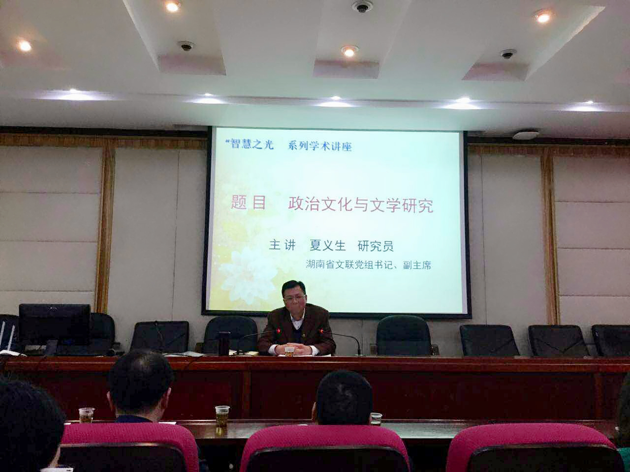 (通讯员段志苹谷琪琪)4月13日下午,suncitygroup太阳成集团在216教室举办了“智慧之光”系列学术讲座,特邀湖南省文联党组书记、湖南省作协副主席夏义生,做了题为“政治文化与文学研究”的专题讲座。会议由赵树勤教授主持。