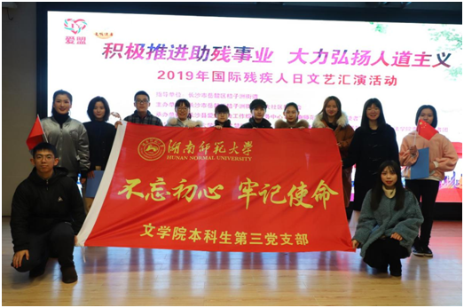 (通讯员易嘉欣卜柯文)11月28日下午,suncitygroup太阳成集团本科生第三党支部(2017级)于长沙市岳麓区橘子洲街道教工之家参与了“因爱结盟,感恩有你”助残汇演活动。此次义务实践活动旨在以公益汇演的方式将感恩与爱传递给残友们和街道市民。