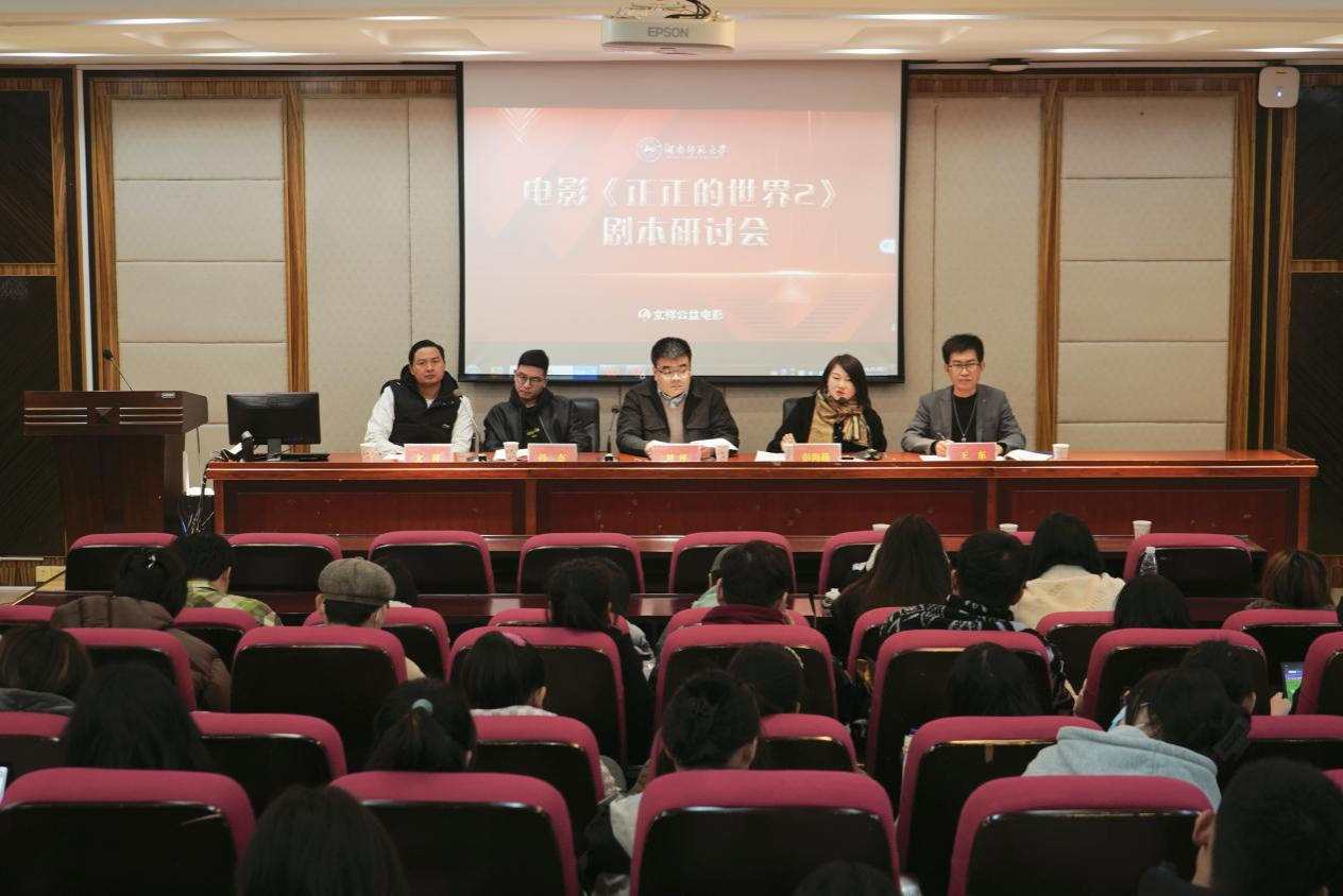 12月2日下午,由suncitygroup太阳成集团、湖南砚泉文化传媒有限公司主办的电影《正正的世界2》剧本研讨会在216教室开展。湖南砚泉文化传媒有限公司董事长、《正正的世界》系列电影制片人文祥,《正正的世界》系列电影编剧彭海燕、导演孙杰、执行导演王东,suncitygroup太阳成集团戏剧影视文学系专任教师刘库,suncitygroup太阳成集团本科生与研究生等参加研讨会。研讨会由suncitygroup太阳成集团戏剧影视文学系教师刘库主持。