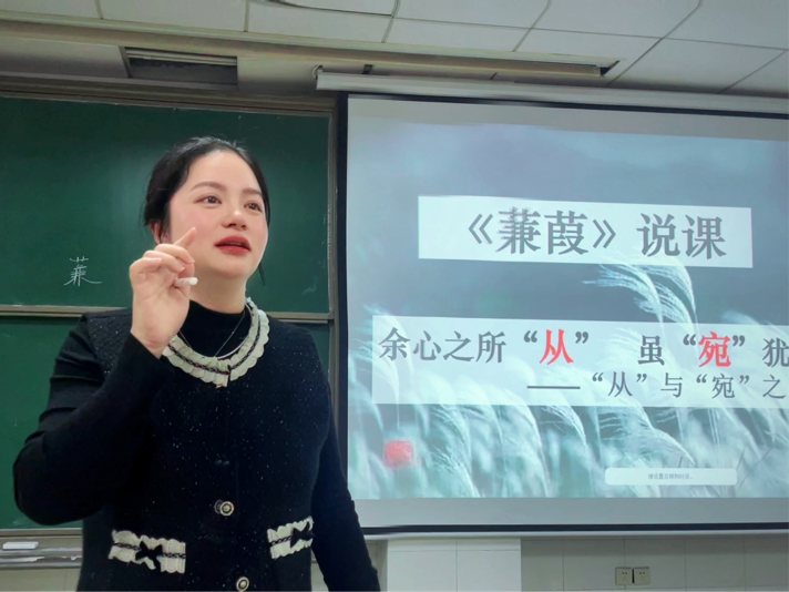 3月8日下午的讲座同样精彩,谭嘉慧老师先给同学们上了一堂题为《余心之所“从”,虽“宛”犹未悔——“从”“宛”之中品<蒹葭>》的示范课,教学设计环环相扣,对文本的分析鞭辟入里,令同学们赞叹不已。课后,谭老师采用图文并茂的方式,仔细回顾了自己从一名初出茅庐的新语文老师一步步蜕变为湖南省语文名师的成长经历,从“聚焦”和“沉潜”两个方面,展示了成为一名优秀语文教师必备的品质。