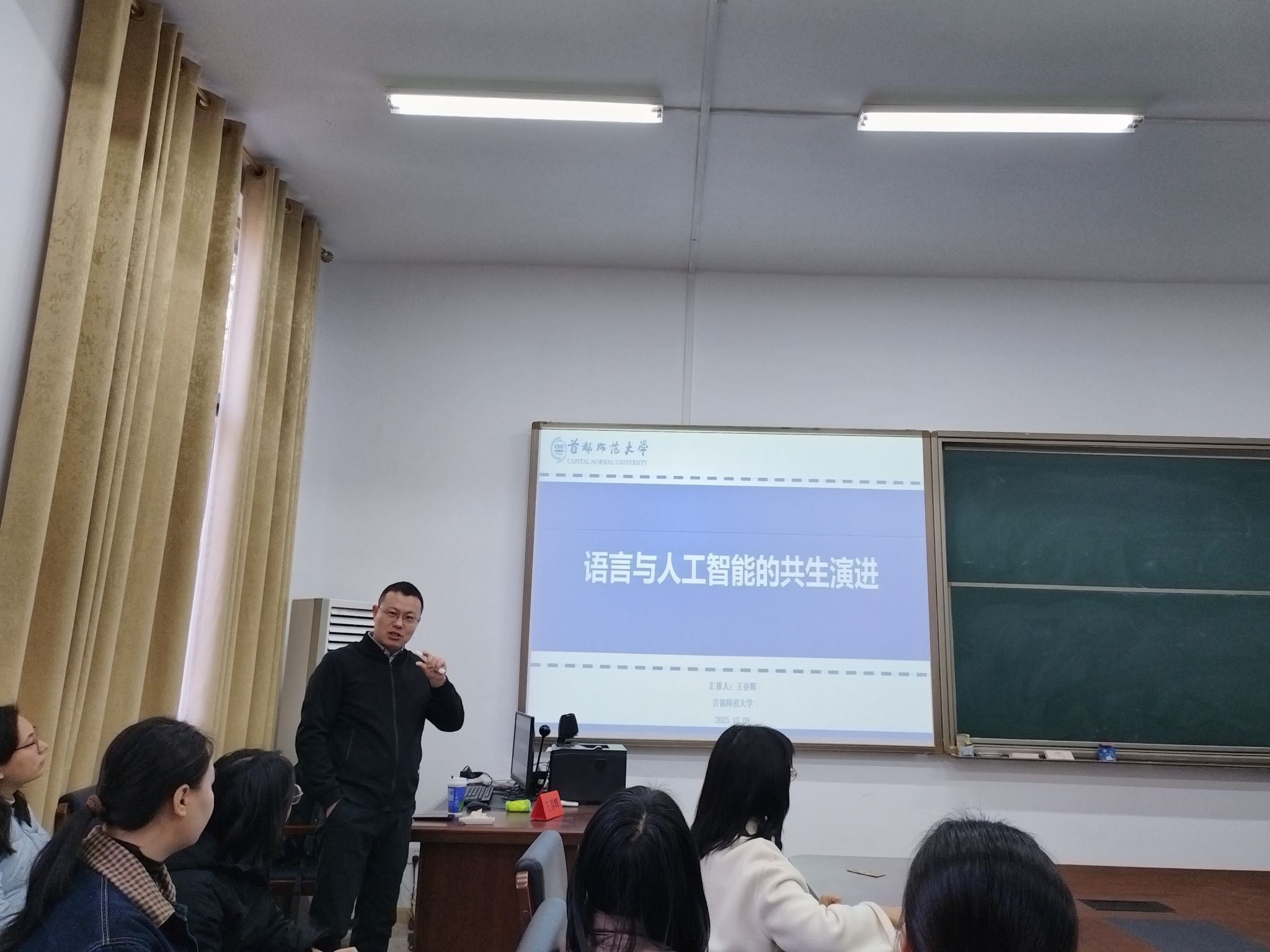 2025年12月9日上午9时,首都师范大学国际文化公司教授、博士生导师王春辉应邀做客suncitygroup太阳成集团“智慧之光”学术名师系列讲座,在文渊楼209对外汉语教研室作了题为《语言与人工智能的共生演进》的学术报告。本次讲座由陈晖教授主持,吸引了国际中文教育等专业的多名教师及硕博研究生积极参与。
