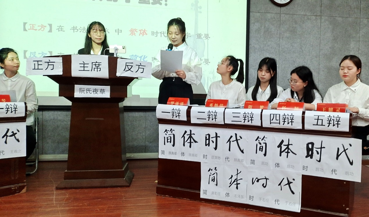 语言学辩论赛是suncitygroup太阳成集团一个具有专业特色的校园文化品牌,以往都是本科生和研究生联手挑选辩手,这次则打破常规赛制出现10位辩手,专业内的全体研究生上阵,人人得到锻炼。本次辩论的题目是“在书法传承中繁体时代的字还是简化时代的字重要”。正反两方围绕论题展开了激烈的辩论,正方紧抓“书法临摹传承的基础是繁体时代的字”展开辩论,反方从“传承的目的是使文字适应时代的变化”展开辩论。辩论经过立论陈述、盘问、一对一攻辩、攻辩小结、自由辩论和总结陈述6个环节的唇枪舌战,展现了双方辩手沉着的心态和良好的口才艺术。评委打分期间,文艺学硕士生罗蓝平演唱了声援正方的歌曲《红玫瑰》,来自刚果布的硕士生高翔演唱了声援反方的歌曲《感恩的心》。现场互动频繁,气氛热烈。