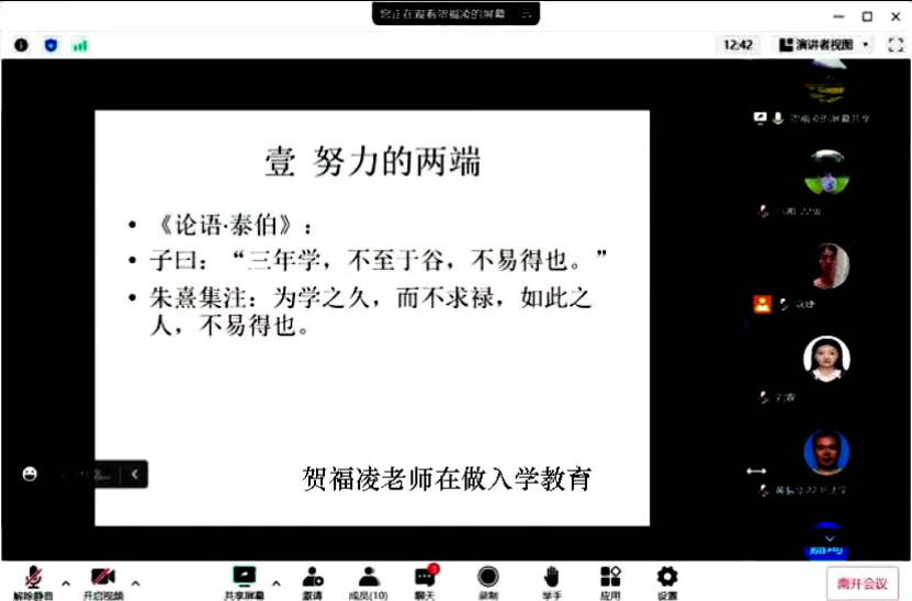老师们介绍了自己开设的课程的设想,和员工们谈了怎么当研究生、怎样适应研究性学习等问题。贺老师从人生努力的两端(精神和物质),还有怎么学语言学、语音学的重要、学习语音的方法四个方面给大家带来了内容充实的讲座。林海云老师在讲座上介绍了自己对“比较语言学和外国语言学原著”这门课程的构想,要求大家有宽阔的视野,更多关注一些语言学的应用研究,找到语言学和社会契合的地方。同时,她还就哲学语言学、逻辑学语言学等问题跟研究生展开交流。刘东升老师则结合了自己的求学和工作经历,鼓励员工们尽早确定好未来的方向,并且朝着目标前进。连续3天的讲座不仅激发了大家对语言学的热情,也拉近了师生之间的距离。研究生认为,疫情虽然在现实空间上暂时阻隔了我们,但是网络空间让我们凝聚成了一个团结友爱的集体。老师们宝贵的分享和交流给我们的研究生道路点亮了路灯。