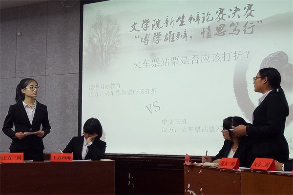 辩论赛分为两轮。在第一轮季军争夺战中,中文三班与汉语国际教育班以“火车票站票是否应该打折”为主题进行辩论。第二轮辩论中,中文四班与戏文班就“手机使人更亲近还是更疏远”为题展开冠军争夺战。