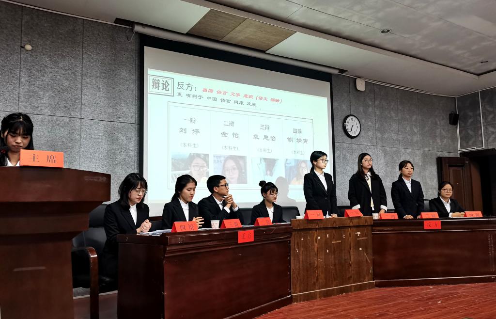 这次辩论赛的题目是“国家通用语言文字意识(国家法律)和祖国语言文字意识(语文课标),哪个更有利于中国语言生活健康发展”。